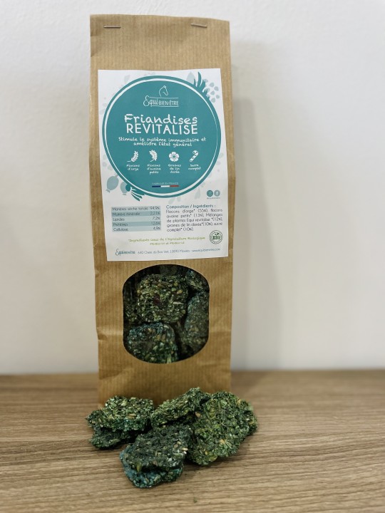 Boost your horse's energy with REVITALISE TREATS. Much more than just a reward, these 100% natural and organic treats incorporate our best remineralizing and toning active ingredients. They are the perfect way to support your horse after intense effort, during molting, or simply to give them a daily vitality boost.